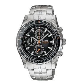 Quartz movement, Dress watch, Chronograph - 1 second, Silver-tone luminous hands and indices, Silver-tone numbers and indices, Polished stainless steel rotating slide rule bezel with embossed white numbers and indices, Polished stainless steel case, selector buttons, crown and screw-in caseback, Mineral crystal, 50 meters/165 feet water resistant