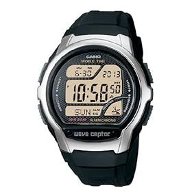 Black Digital Wave Ceptor Watch with Resin Band featuring Countdown Timer, World Time, 1/100 Second Stopwatch and EL backlight with Afterglow. Technical Specs: Multi-Band Atomic Timekeeping (US, UK). Receives time calibration radio signals which keep the displayed time accurate. Auto receive function (6 times per day). Manual receive function. Signal: US WWVB, UK MSF Frequency: US, UK 60kHz. 50M Water Resistant. EL Backlight with Afterglow. World Time. 29 times zones (48 cities), city code display, daylight saving auto/on/off. Daily Alarm. Countdown Timer. Measuring unit: 1 second. Countdown range: 1 second to 60 minutes. 1/100 second digital stopwatch. Measuring capacity: 59'59.99". Measuring modes: Elapsed time, lap time, split time, 1st-2nd place times. Hourly Time Signal. Auto Calendar (pre-programmed until the year 2099). 12/24 Hour Formats.