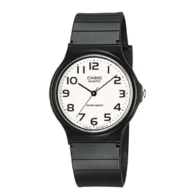 Quartz movement, Black hands, Large black numbers, Small black markers on outer dial, Black bezel, Stainless steel crown & caseback, Water resistant